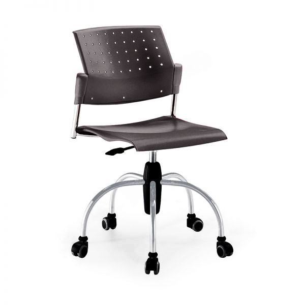 Silla con asiento en polipropileno y respaldo tapizado en malla. Base de 5 puntas CROMADA con rodajas, ajuste altura con pistón. Para uso interno.